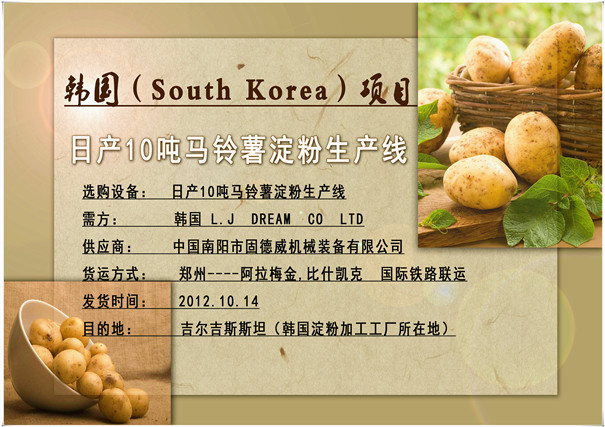 2012年8月13日雙方確定合作意向,簽訂合同,購(gòu)買產(chǎn)品線---日產(chǎn)10噸馬鈴薯淀粉生產(chǎn)線。并明確規(guī)定由中國(guó)固德威公司提供淀粉工廠設(shè)計(jì)圖紙、設(shè)備連接圖紙、安裝技術(shù)工人等服務(wù)項(xiàng)目。