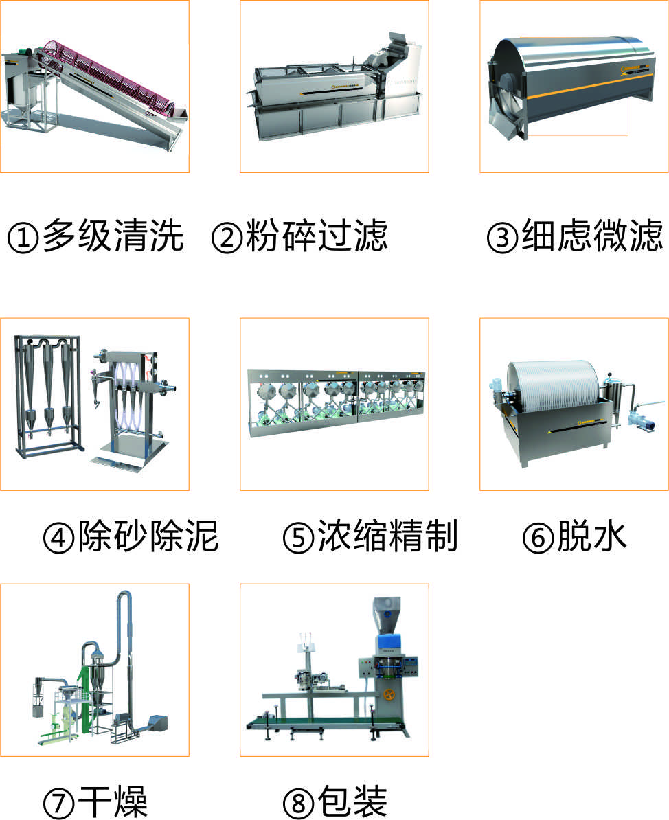 多級清洗-粉碎過濾-除砂除泥-濃縮精制-脫水-干燥-包裝